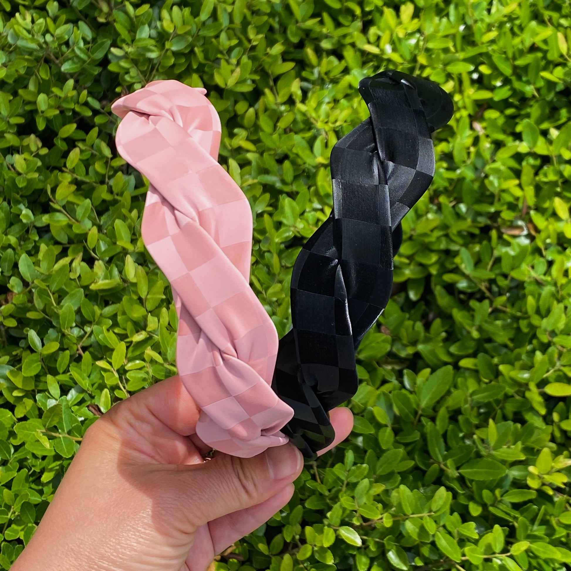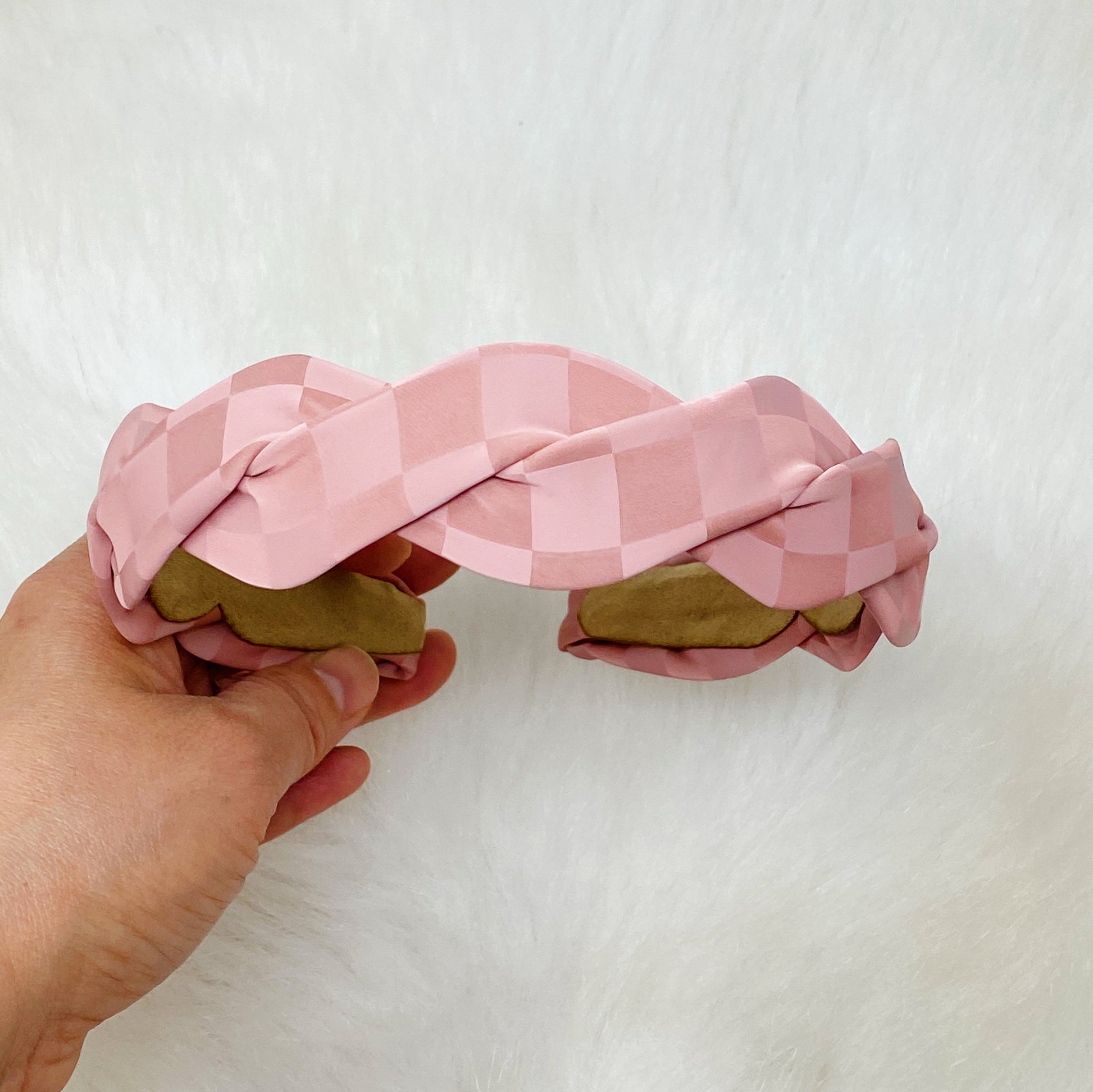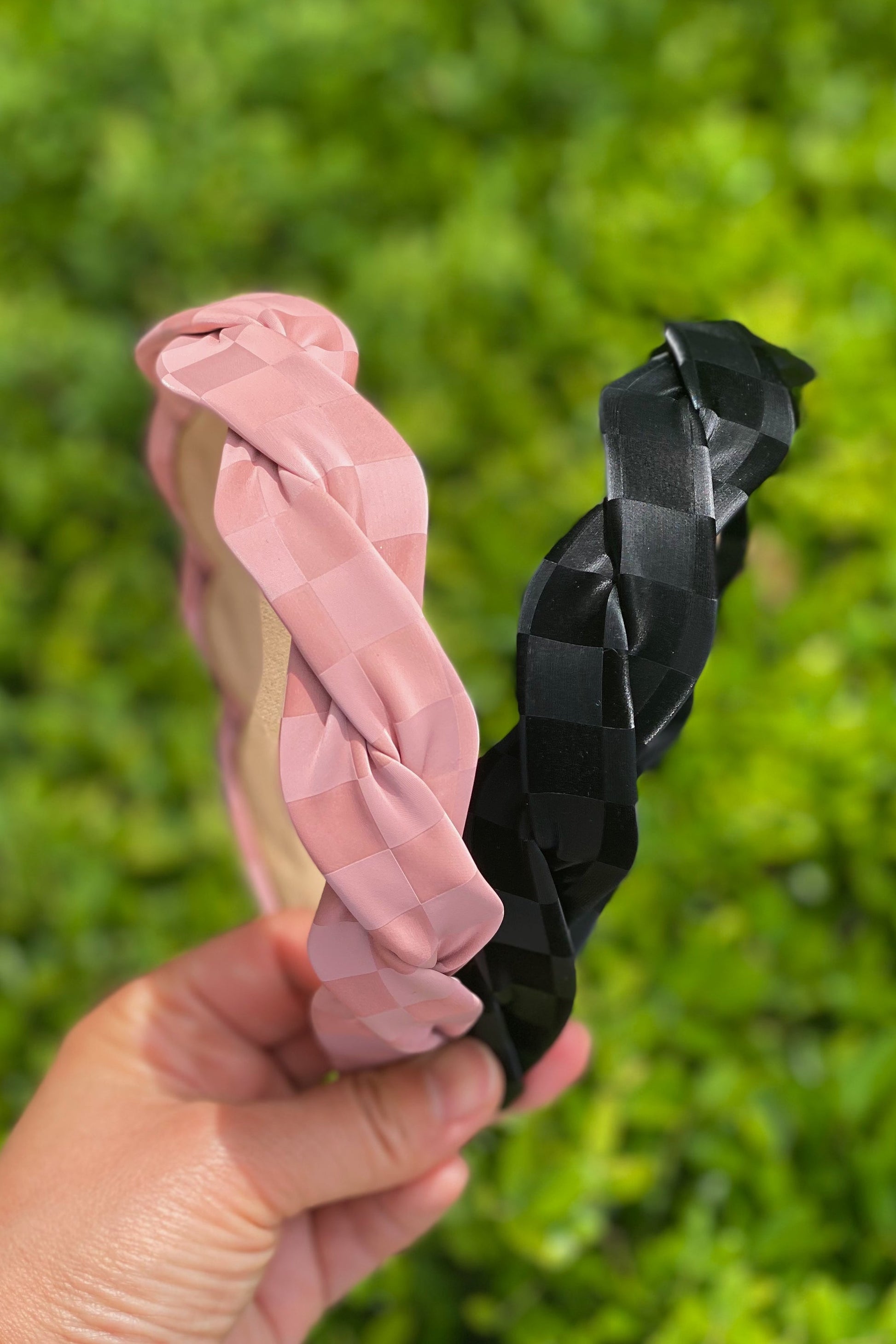 This twisted, muted checkerboard print headband is so trendy and fun! Perfect for everyday wear.